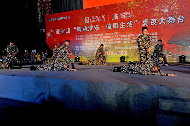 7月30日晚,淮安市公安局在體育館廣場舉辦“舞動淮安·健康生活”夏夜大舞臺市民健身活動公安專場演出?;顒釉诩ぐ旱墓捻嵚曋欣_帷幕。總公司的精彩的擒敵表演、開場舞以及《當祖國召喚》等節(jié)目參加活動,贏得了現(xiàn)場市民的陣陣掌聲?;顒又羞€進行了省十八屆運動會和健康生活知識有獎問答。市局黨委委員、機關黨委書記蘇必偉、總公司總經(jīng)理婁伯翱等領導在現(xiàn)場觀看了演出。市交巡警支隊、特警支隊、總公司人防中心等100余人參加活動