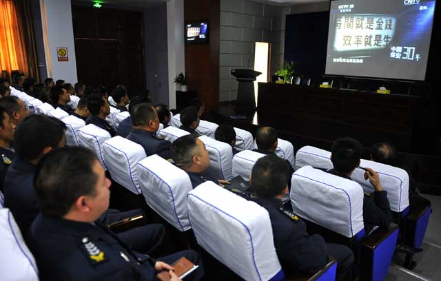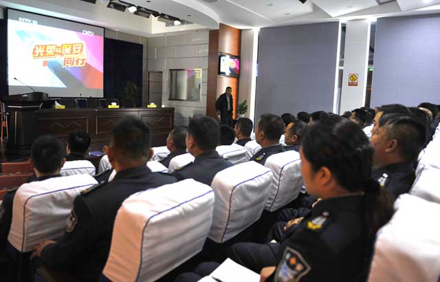 2014年10月27日上午,總公司周一早例會結(jié)束后,與會人員在報告廳一起觀看了《光榮與保安同行》電視專題片。