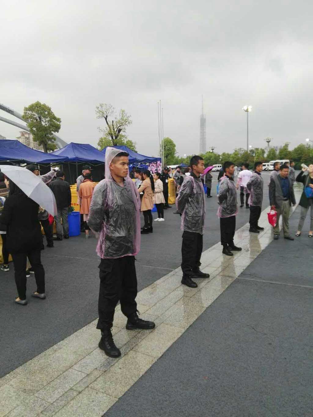 “1號點到位、2號點到位、3號點到位······”,根據(jù)指揮部的統(tǒng)一部署,從5月2日14:00開始,參加執(zhí)勤的第一批人防保安員700余人到達指定地點集結(jié),16:00所有人員全部進入預(yù)定崗位開展工作,晚會雖然只有短短的三小時時間,但保安人員一直至深夜24:00全才陸續(xù)結(jié)束任務(wù),安全歸隊。特別在17:00開始檢票至19:30演出這段時間,天降大雨,雨水淋了外衣,汗水濕透襯衣,但所有執(zhí)勤人員沒有因為大雨而離開崗位,他們?nèi)繄允貚徫?,認真履職,確保觀眾安全有序進場。