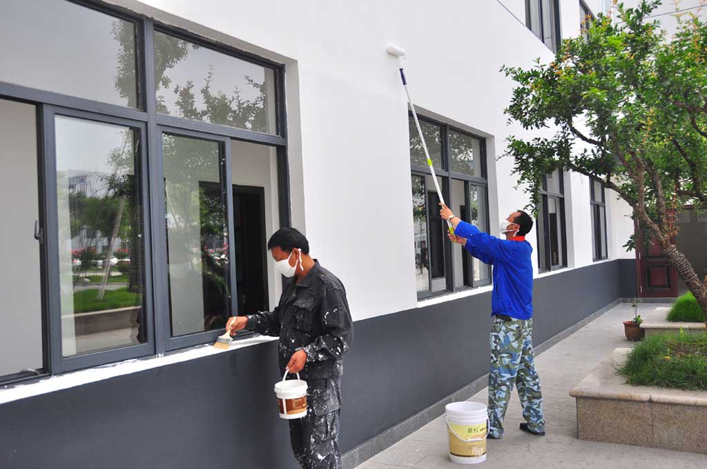由于時間緊、工程量大、任務(wù)重,為了提前完工,他們在保證工程質(zhì)量的前提下,放棄了一切休息時間,不顧天氣炎熱,加班加點,全身心投入到地板油漆的粉刷、押運樓墻面修繕和粉刷之中。