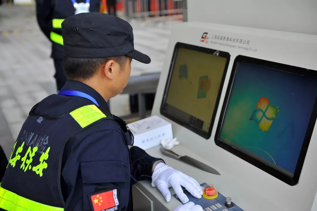 執(zhí)勤人員在安檢口對包裹進行檢查
