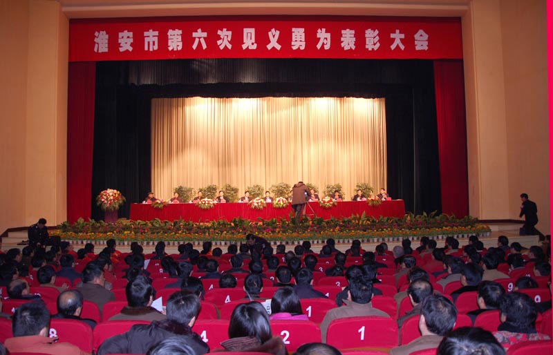 12月24日上午,我市在淮安人民大會堂召開第六次見義勇為表彰大會,對全市58名見義勇為先進個人進行表彰。會議由市委常委、秘書長、常務副市長陳洪玉主持,副市長、公安局長倪興余宣讀了《市政府關于表彰見義勇為先進個人的通報》,市見義勇為基金會理事長李繼堯宣讀了《市見義勇為基金會關于給唐子年等同志頒發(fā)獎金和撫恤金的決定》,兩名見義勇為先進個人代表在會上發(fā)言,市委書記劉永忠同志到會并作重要講話。市政協(xié)主席王維凱,市人大代理主任范學恕,市局副局長徐乾,市局黨委委員、政治部主任王國慶及各縣(區(qū))委、政府、市經濟開發(fā)區(qū)管委會分管負責人,公安(分)局局長、政委,市法院、檢察院分管負責人;市委各部委辦、市各委辦局、市各直屬單位、部省屬駐淮單位、市各大中專院校分管負責人,部分大中專院校學生以及市各新聞單位的記者共1500人參加了會議。