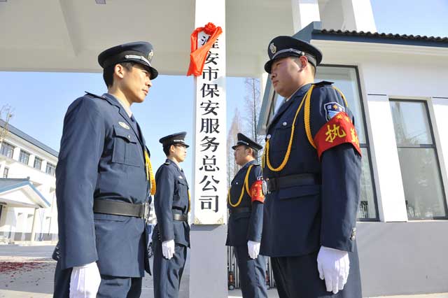 雖然室外氣溫格外寒冷,但這里卻充滿了春天的氣息。上午9時50分,4名禮儀保安抬著一塊披著紅綢的標牌, 邁著整齊的步伐走向公司大門,9時58分,江蘇省淮安市保安服務總公司標牌緩緩地、平穩(wěn)地掛了起來,現(xiàn)場響起陣陣鞭炮聲和熱烈的掌聲,大家共同為總公司新址掛牌而歡欣鼓舞。