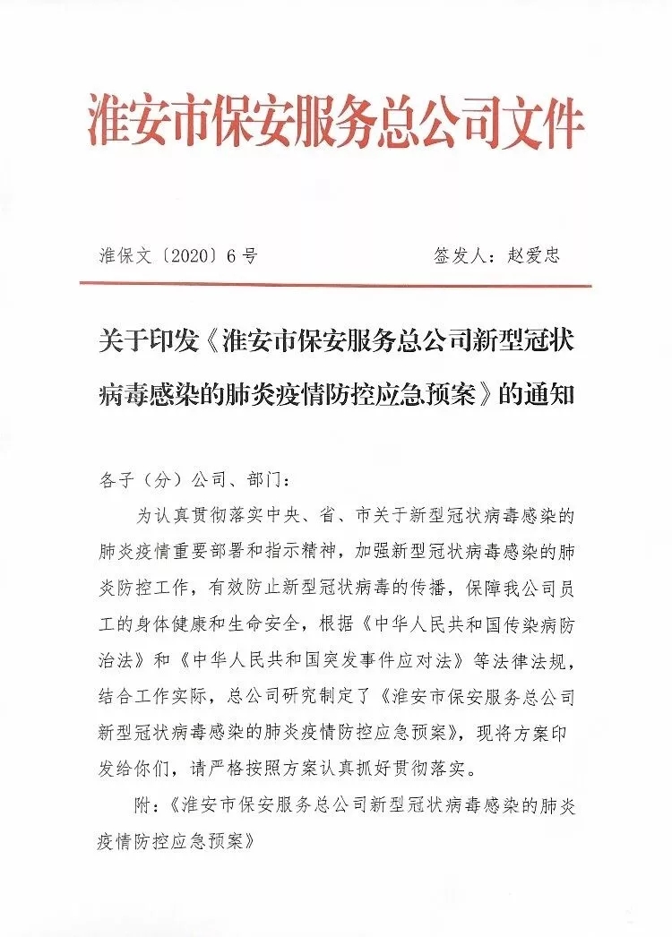 疫情就是命令,防控就是責(zé)任。總公司黨總支積極應(yīng)對(duì),超前部署,1月26日,總公司制定并下發(fā)《淮安市保安服務(wù)總公司新型冠狀病毒感染的肺炎疫情防控應(yīng)急預(yù)案》、《關(guān)于成立新型冠狀病毒感染的肺炎疫情防控應(yīng)急工作領(lǐng)導(dǎo)小組的通知》、《致全體黨員的一封公開(kāi)信》。春節(jié)期間,總公司黨總支書記、總經(jīng)理趙愛(ài)忠等領(lǐng)導(dǎo)班子多次深入基層督導(dǎo)疫情防控工作。總公司利用微信群、工作群對(duì)疫情防范工作進(jìn)行再部署、再安排、再要求,要求各級(jí)管理人員要把疫情防控作為當(dāng)前最大的政治任務(wù),切實(shí)履職擔(dān)責(zé),認(rèn)真抓好疫情防控工作,做到全員宣傳到位、措施到位、防范到位。