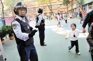 人民網(wǎng)·天津視窗10月11日電:頭頂防暴頭盔,身穿防刺背心,手袋防割手套,腰佩催淚瓦斯和橡膠警棍,天津濱海新區(qū)188所公辦中小學(xué)、幼兒園的保安全部被武裝起來,在上下學(xué)時成為師生們的保護(hù)神。