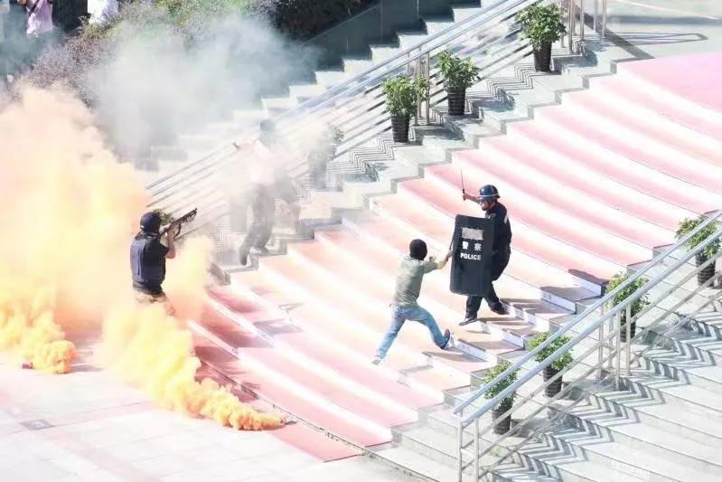 押運(yùn)人員迅速還擊,“持槍”嫌疑人被當(dāng)場擊斃,1名“持刀”嫌疑人被安保人員現(xiàn)場制服,見“搶劫”無望,另一名“持刀”嫌疑人順勢劫持了1名女性銀行工作人員,并逐步移動到階梯上背靠墻壁處,以此為掩體與民警形成對峙。