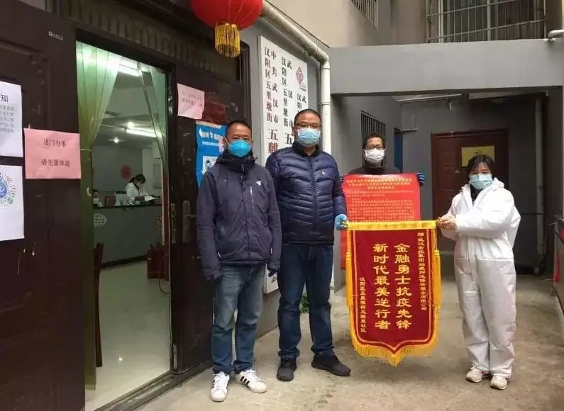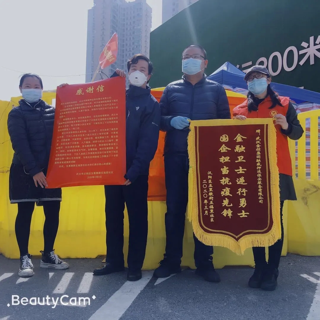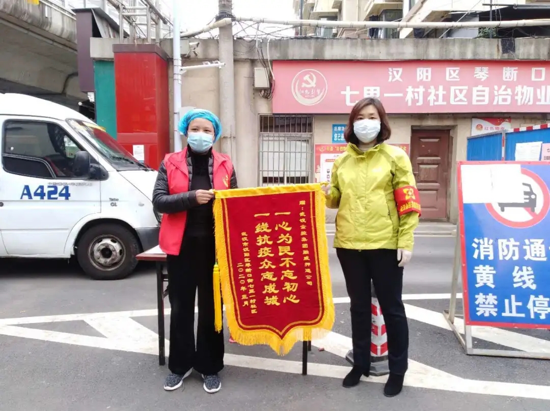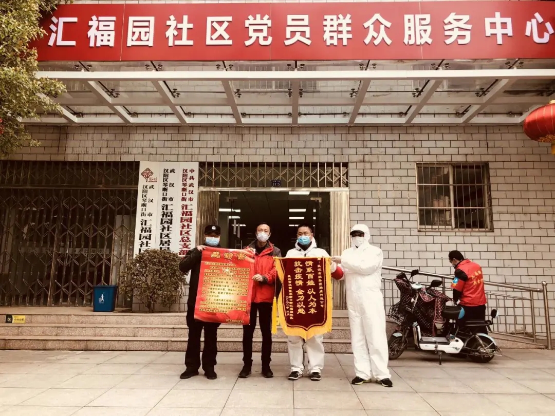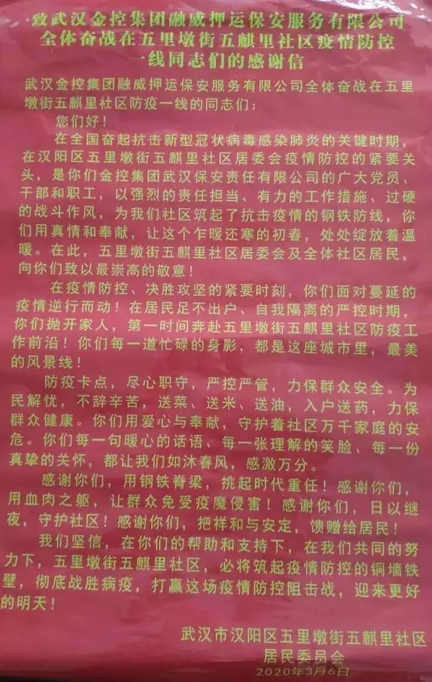 3月8日,漢陽區(qū)五里墩街五麒里社區(qū)向融威公司抗疫一線值守人員贈送感謝信和錦旗