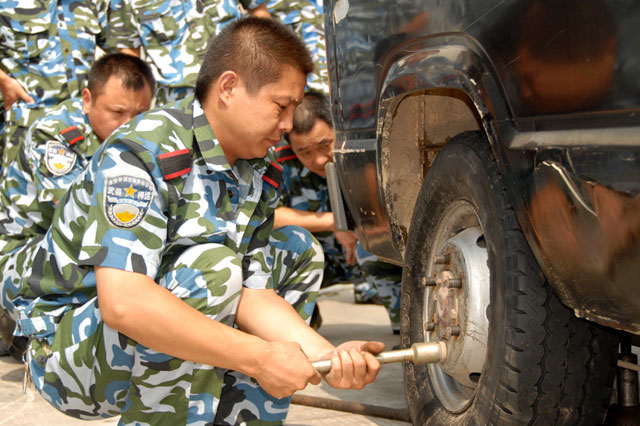 2008年8月3日上午,一名押運(yùn)駕駛員在爭(zhēng)分奪秒地更換輪胎。當(dāng)日,淮安保安總公司舉行了運(yùn)鈔車駕駛員技能大比武,來(lái)自市區(qū)的50余名運(yùn)鈔車駕駛員冒著酷暑進(jìn)行了障礙駕駛、更換輪胎、車輛故障排除等駕駛技能的角逐。