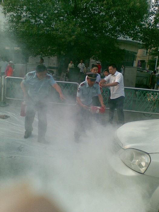 當(dāng)天,健康東路上一輛蘇AV486白色別克轎車在行駛至市財(cái)政局門前時(shí)車頭突然冒煙,隱約有明火竄出,引來(lái)路邊很多市民圍觀,正在市財(cái)政局開會(huì)的保安大隊(duì)長(zhǎng)薛松發(fā)現(xiàn)后,立即帶隊(duì)員尚月龍?zhí)嶂鴾缁鹌髭s到現(xiàn)場(chǎng),一邊疏散周圍路人和過(guò)往車輛。一邊用滅火器進(jìn)行撲救,由于撲救及時(shí),該車損失不大。