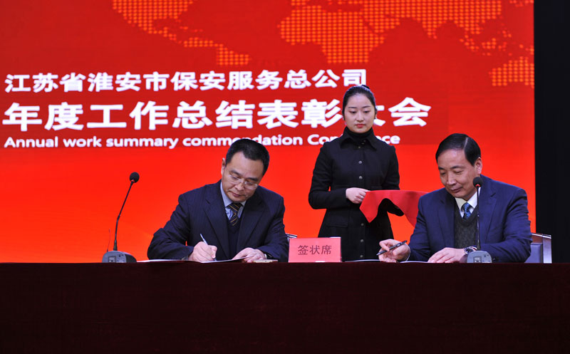 會(huì)議通過多媒體工作報(bào)告對淮安保安2016年度工作進(jìn)行了總結(jié),表彰了年度工作突出的先進(jìn)集體和先進(jìn)個(gè)人,對公司2017年度工作進(jìn)行了部署。婁伯翱總經(jīng)理代表總公司與押運(yùn)管理中心、人防管理中心、駐外分公司等13個(gè)部門簽署了2017年度目標(biāo)責(zé)任狀。