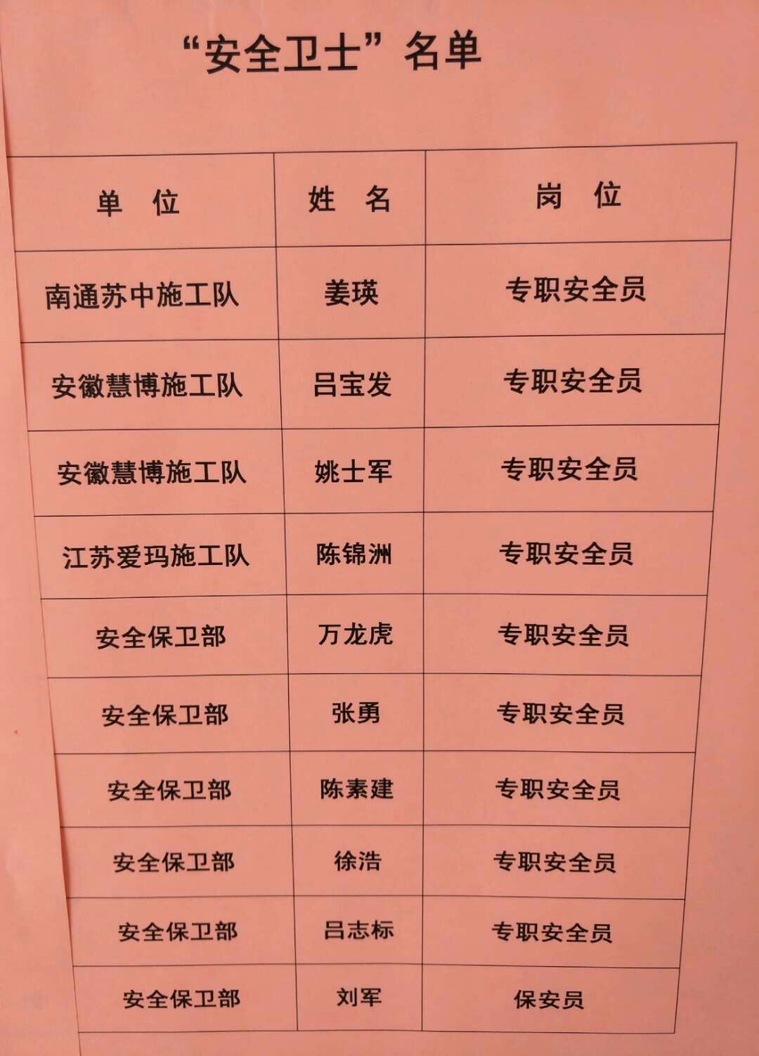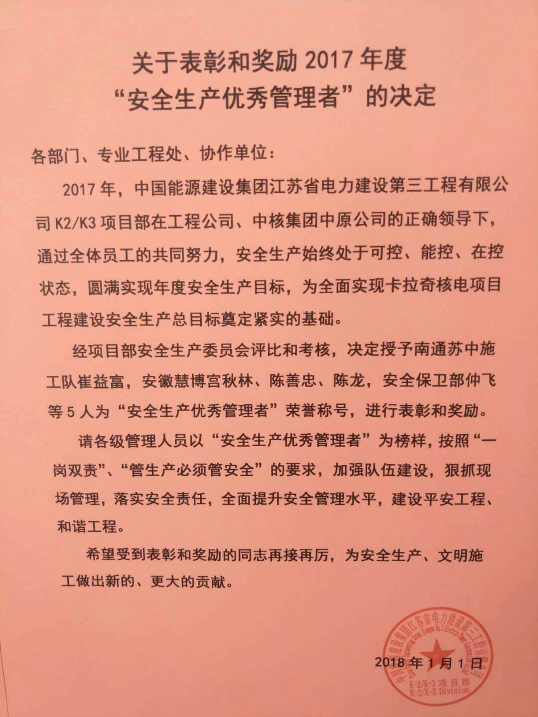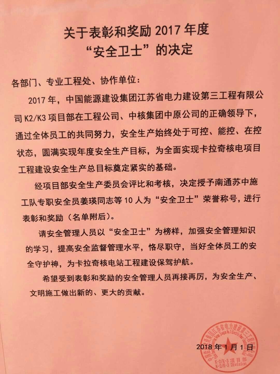 2018年第一天,總公司駐巴基斯坦卡拉奇執(zhí)勤點保安員受到中國能源建設(shè)集團江蘇省電力建設(shè)第三工程有限公司K2/K3項目部的表彰和獎勵,仲飛榮獲“安全生產(chǎn)優(yōu)秀管理者”稱號;萬龍虎、張勇、陳素建、徐浩、呂志標、劉軍等6名安全員榮獲“安全衛(wèi)士”稱號。