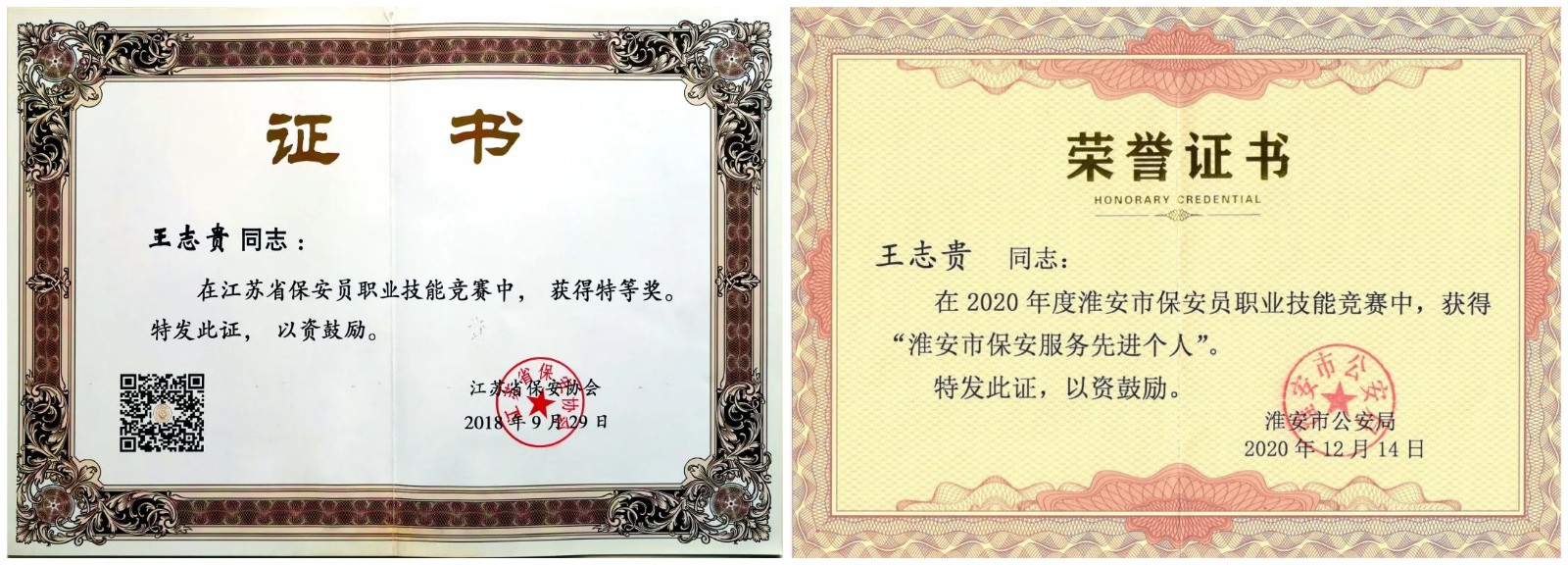 押運(yùn)車(chē)長(zhǎng)王志貴同志,本科學(xué)歷,中共黨員,保安員國(guó)家職業(yè)技能等級(jí)二級(jí),保安技師資格證。工作十幾年來(lái),他始終保持軍人本色,服從命令,聽(tīng)從指揮,愛(ài)崗敬業(yè),不斷挖掘自己的內(nèi)在潛能,多次參加省、市保安職業(yè)技能大賽,先后榮獲省、市數(shù)次獎(jiǎng)項(xiàng):2018年度,在江蘇省保安職業(yè)技能競(jìng)賽中,獲得“特等獎(jiǎng)”,被授予“江蘇省技術(shù)能手稱號(hào)”,被總公司評(píng)為“十佳保安”;2019年度,被總公司評(píng)為“優(yōu)秀車(chē)長(zhǎng)”、“押運(yùn)紅旗車(chē)組”;2020年度,被授予“江蘇省技術(shù)能手”、“江蘇省五一創(chuàng)新能手”、“江蘇省青年崗位能手”、“淮安市青年崗位能手”、“淮安市技術(shù)能手”、“淮安市五一創(chuàng)新能手” 等榮譽(yù)稱號(hào),被淮安市公安局評(píng)為“淮安市保安服務(wù)先進(jìn)個(gè)人”。